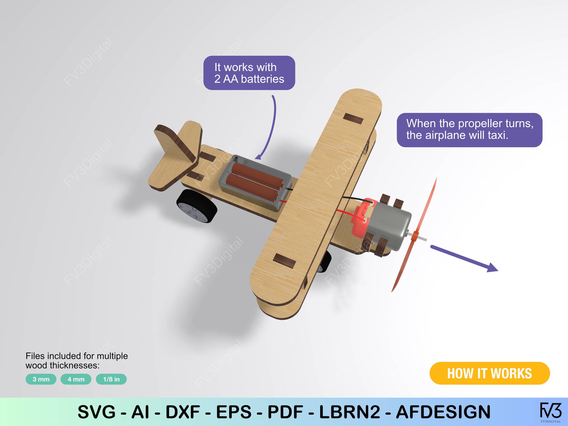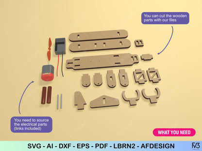 Launch into hands-on engineering with these laser-cut files to build a functional propeller airplane that taxis across smooth surfaces. This isn’t just a model—it’s a working demonstration of physics principles, designed to inspire future aviators and engineers. Watch as your creation converts electrical energy into motion, showcasing the same forces that propel real aircraft.